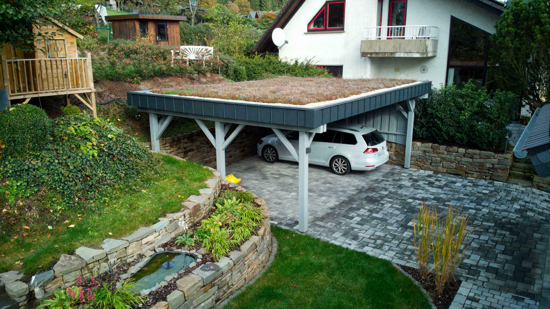 Ein LENNECARport mit extensiver Dachbegrünung